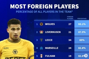 德转列外援占比最高球队:狼队压药厂居首,马赛、利物浦在列